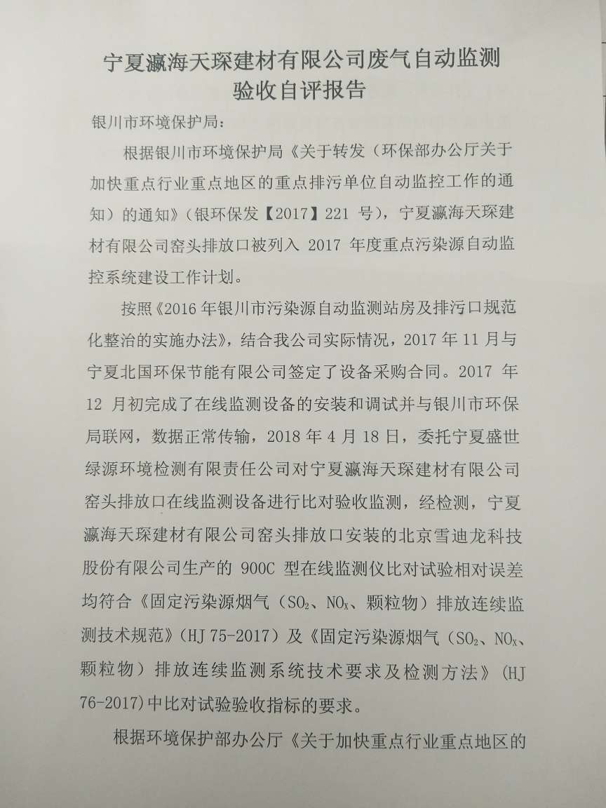 寧夏瀛海天琛建材有限公司廢氣自動(dòng)監(jiān)測(cè)驗(yàn)收自評(píng)報(bào)告